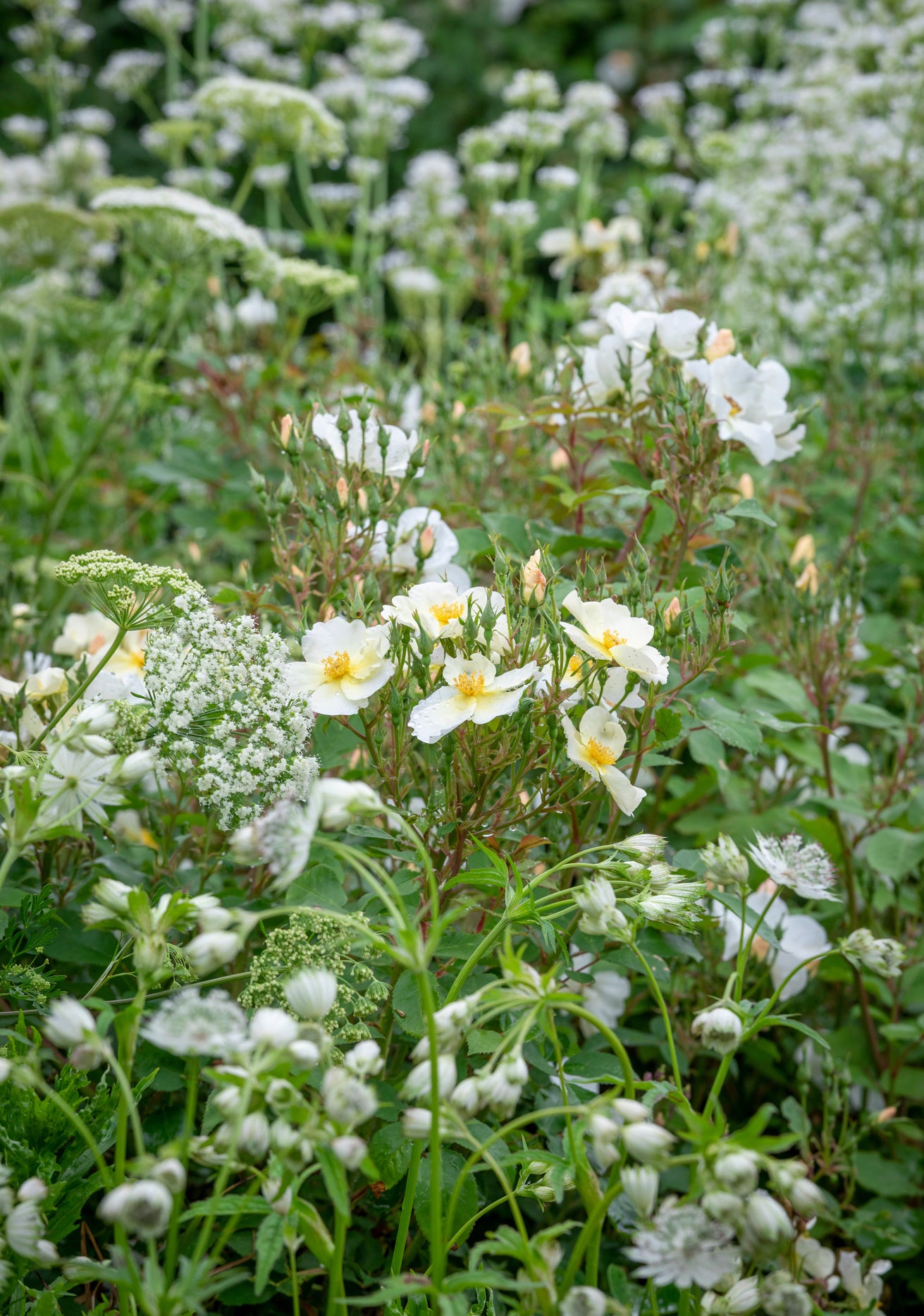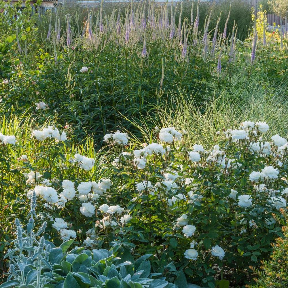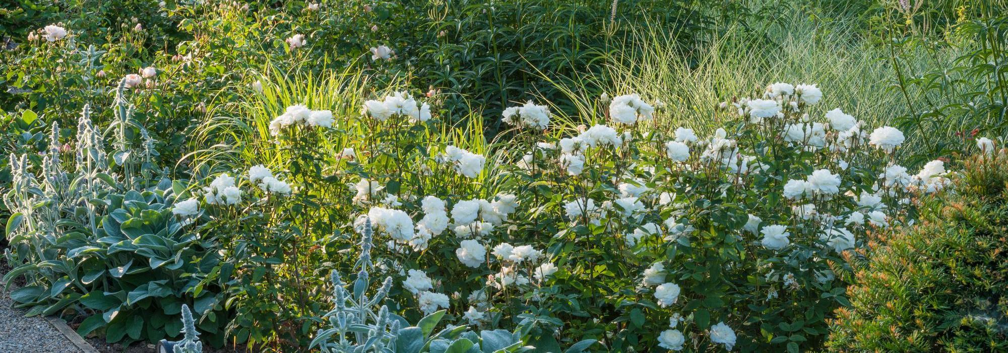 Ergänzen Sie Ihre Rosen mit Pflanzen, die die helle Farbwelt aufgreifen und gleichzeitig Struktur und Bewegung bringen.