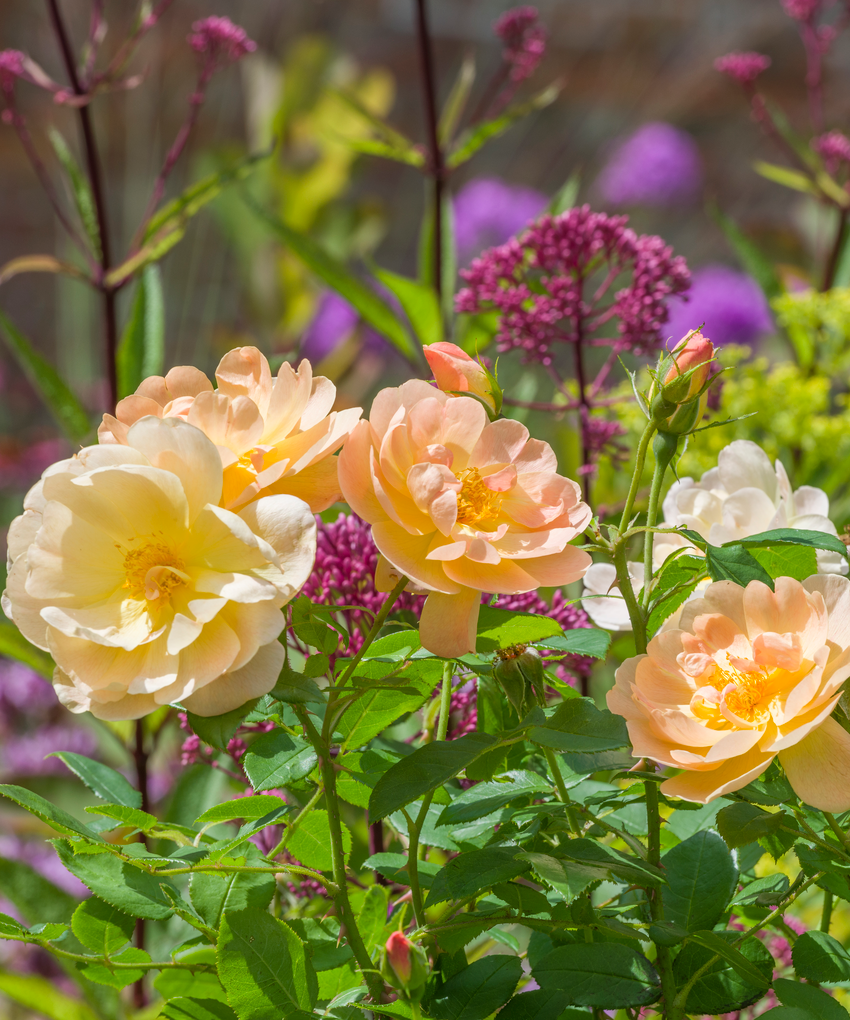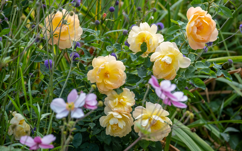 Rosa ‘The Lark Ascending’ (Ausursula), Achillea ‘Pretty Belinda’, Agastache ‘Blue Fortune’, Althaea cannabina, Verbena officinalis var. grandiflora ‘Bampton’, Selenium wallichianum, Geranium ‘Mavis Simpson’, Asclepius incarnata, Anemone x hybrida ‘Königin Charlotte’.