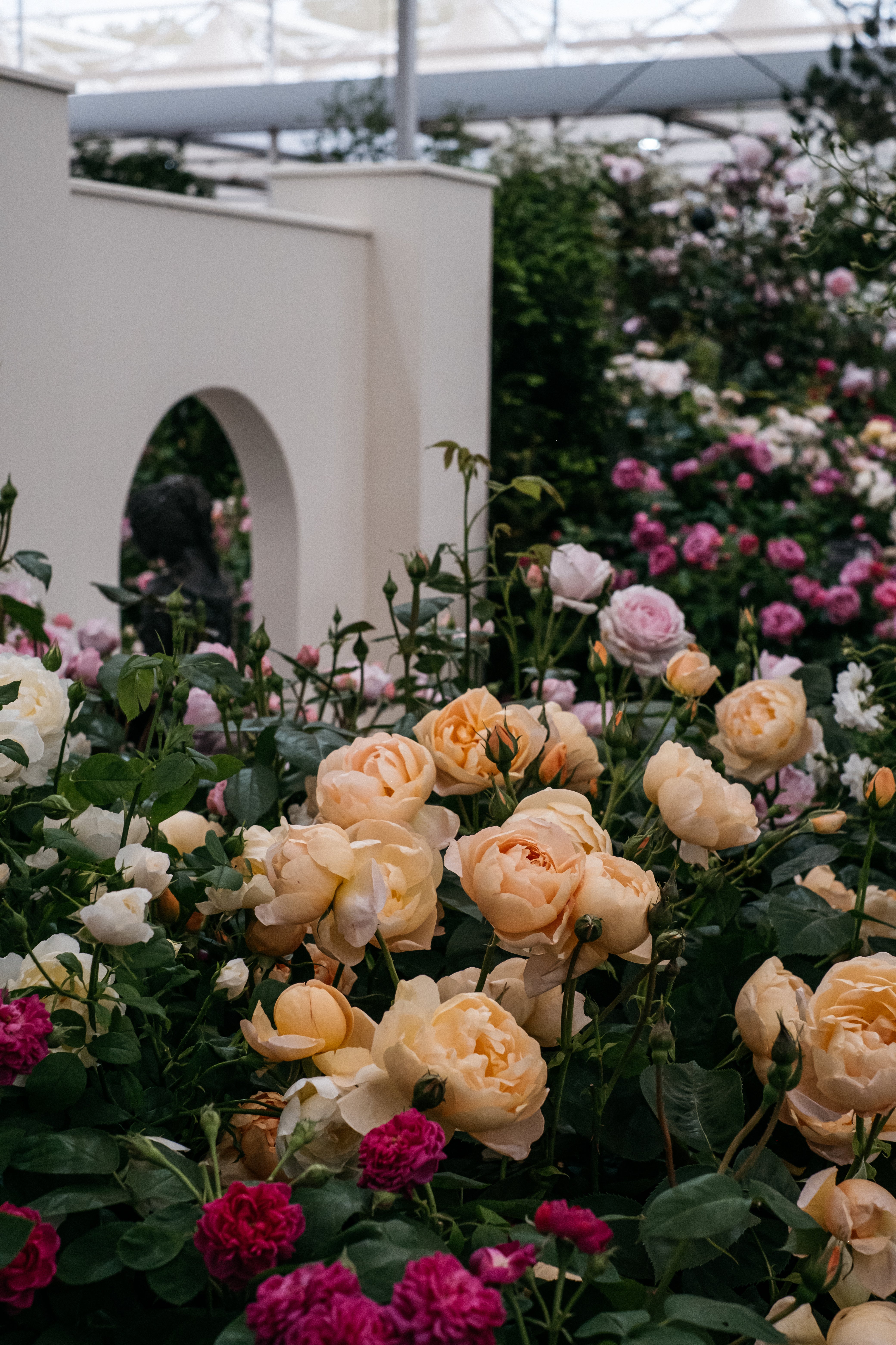 Jede dieser Rosen hat ihren ganz eigenen Ausdruck – gemeinsam aber fügen sie sich zu einer stimmigen, charaktervollen Komposition voller Atmosphäre und Gefühl.Dieser großzügigen Pflanzung folgt ein geschwungener Pfad, der die Besucher unter einer Reihe von rosenüberwachsenen Bögen hindurchführt. Jeder Bogen ist mit Rambler-Rosen bepflanzt – ausgewählt nicht nur wegen ihrer Schönheit, sondern auch wegen ihres Ausdrucks. Diese Bögen führen sanft durch den Garten, fügen Höhe und Bewegung hinzu und schaffen wechselnde Licht- und Schattenspiele beim Durchschreiten. Direkt hinter den Bögen umgibt eine ordentliche Hecke aus Queen of Sweden™ (Austiger) den gesamten Garten. Mit ihrem aufrechten Wuchs und ihren zartrosa Blüten erzeugt sie ein Gefühl stiller Umrahmung – ein letzter weicher Rahmen, der alles zusammenhält.
