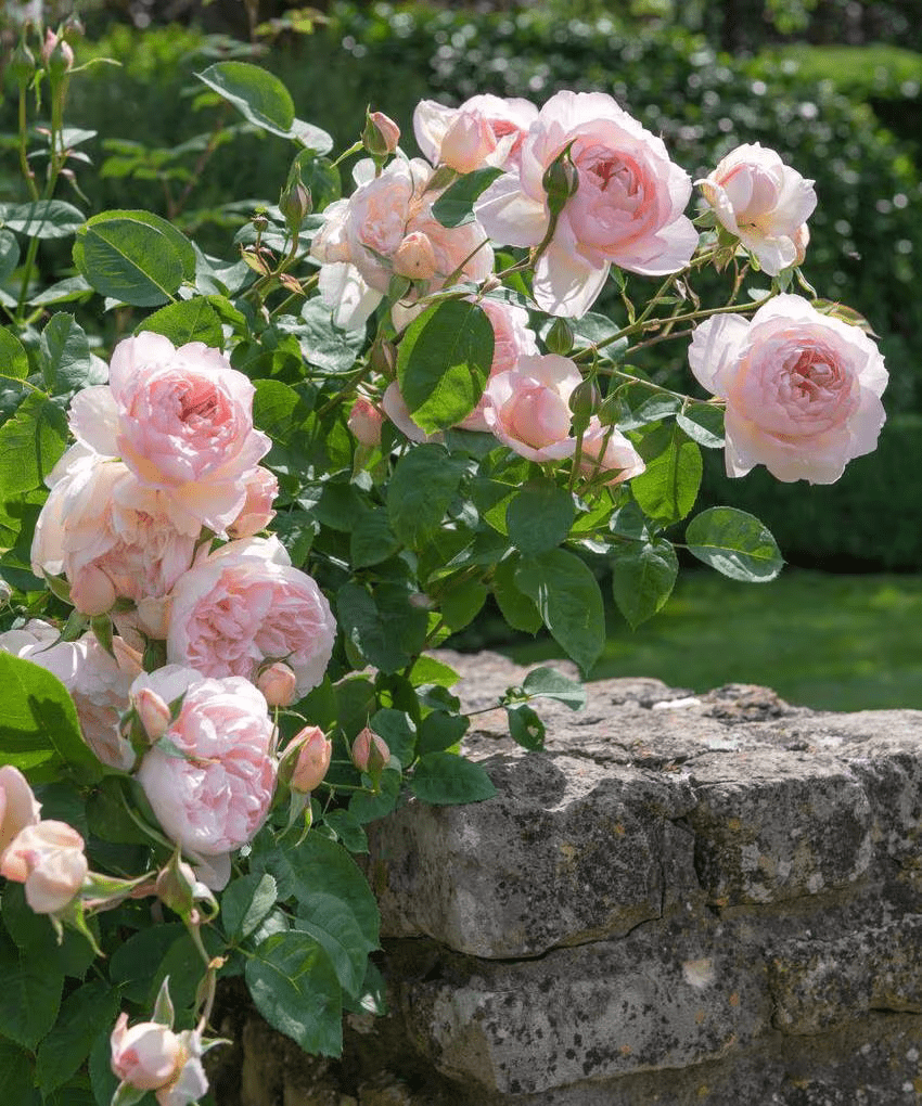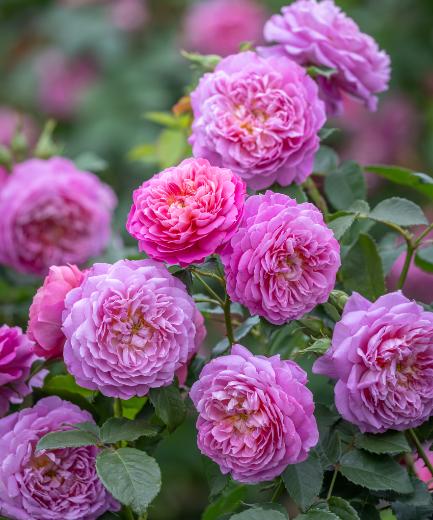 Wunderschön in allen Phasen, mit kleinen, mittelgroßen, cupped Rosetten in Mittelpink. Die überhängenden Zweige sind mit glänzendem, dunklem Laub bedeckt.STRAWBERRY HILL