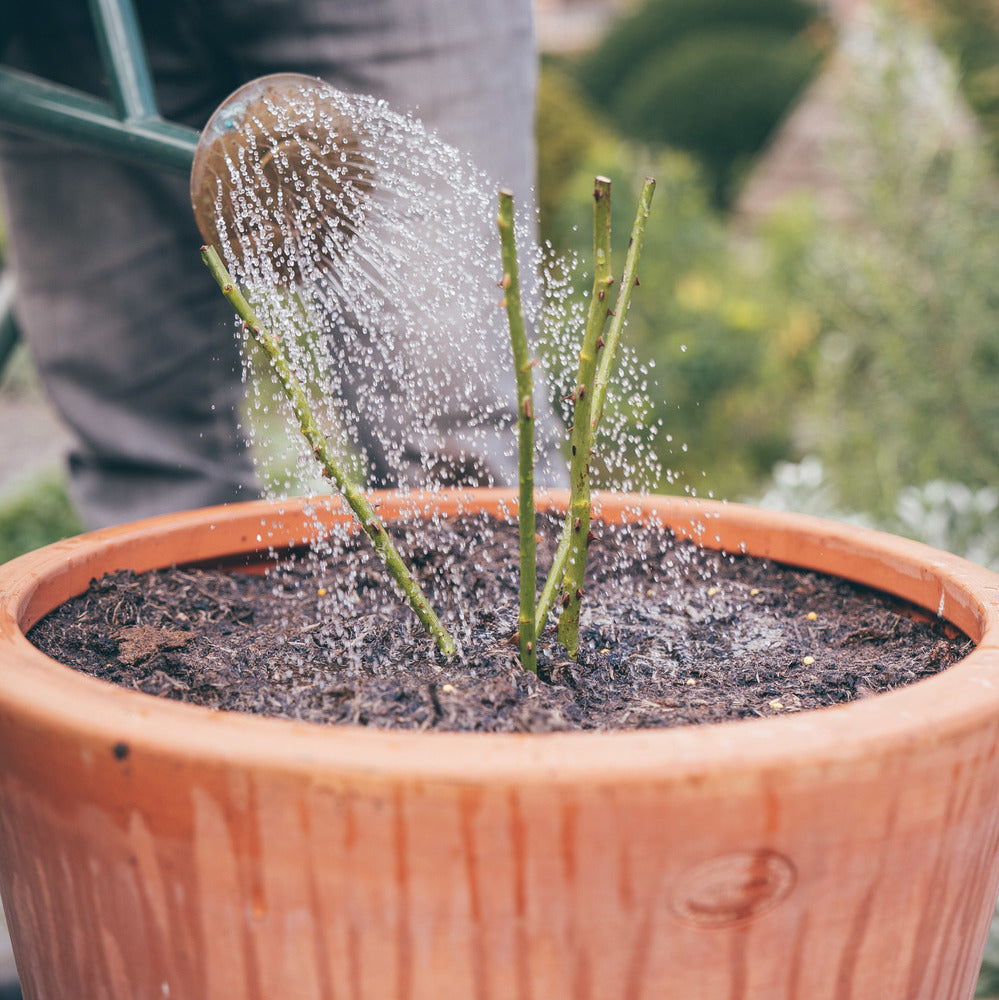 In den ersten Monaten konzentrieren sich Wurzelnackte Rosen darauf, starke Wurzeln zu bilden. Ohne diese können sie das Wasser und die Nährstoffe nicht aufnehmen, die sie zum Gedeihen brauchen. Eine ordnungsgemäße Bewässerung hilft dabei, den Transplantationsschock zu lindern, fördert das tiefere Wurzelwachstum, unterstützt gesundes Wachstum und hilft den Rosen, stark gegen Schädlinge und Krankheiten zu bleiben.