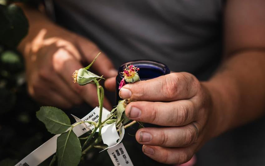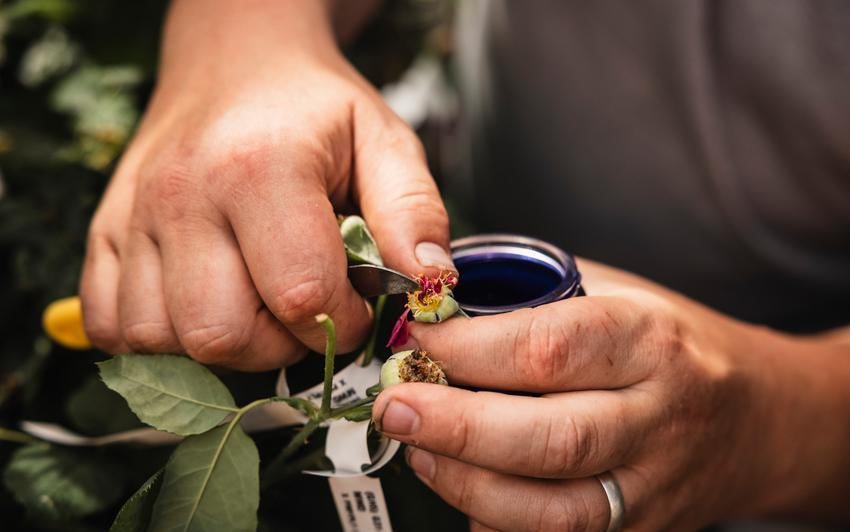 Nach der Auswahl wird der Pollen einer Elternrose behutsam entnommen und von Hand auf die Narbe der anderen übertragen. Was in der Natur Bienen übernehmen, geschieht hier mit größter Präzision. Jedes Jahr führen wir viele Tausend dieser Bestäubungen durch.