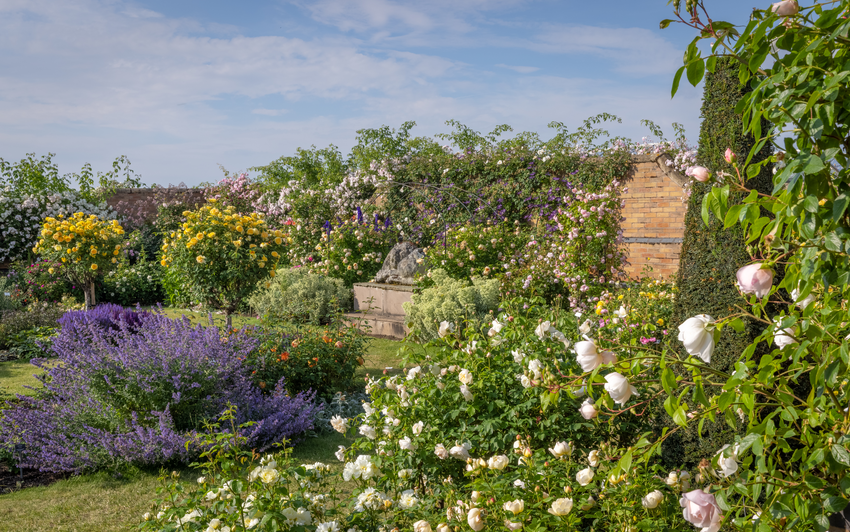 Der Löwengarten verdankt seinen Namen einer Löwenskulptur, die vom verstorbenen Pat Austin geschaffen wurde und einen wundervollen Blickpunkt in diesem Bereich bildet. In vier langen Rabatten bietet eine Mischung aus Strauchrosen, darunter auch viele Englische Rosen, und krautigen Staudenpflanzen einen wundervollen Kontrast der Farben, Formen, Texturen und Düfte. In Abständen gepflanzte, prachtvolle Standard-Rosenbäume bringen zusätzlich Höhe und Struktur in den Garten.