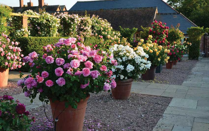 Der TerrassengartenIn unserem Terrassengarten wachsen Englische Musterrosen in einer Reihe großer, dekorativer Terrakottatöpfe. Englische Rosen eignen sich mit ihrem graziös runden, strauchigen Wuchs ideal zum Anpflanzen in diesen Töpfen. Sie bringen Charakter und Interesse in den mit Kies bedeckten Bereich um das Pflanzenzentrum herum, und ihre wunderschönen, köstlich duftenden Blüten lassen sich aus der Nähe genießen.